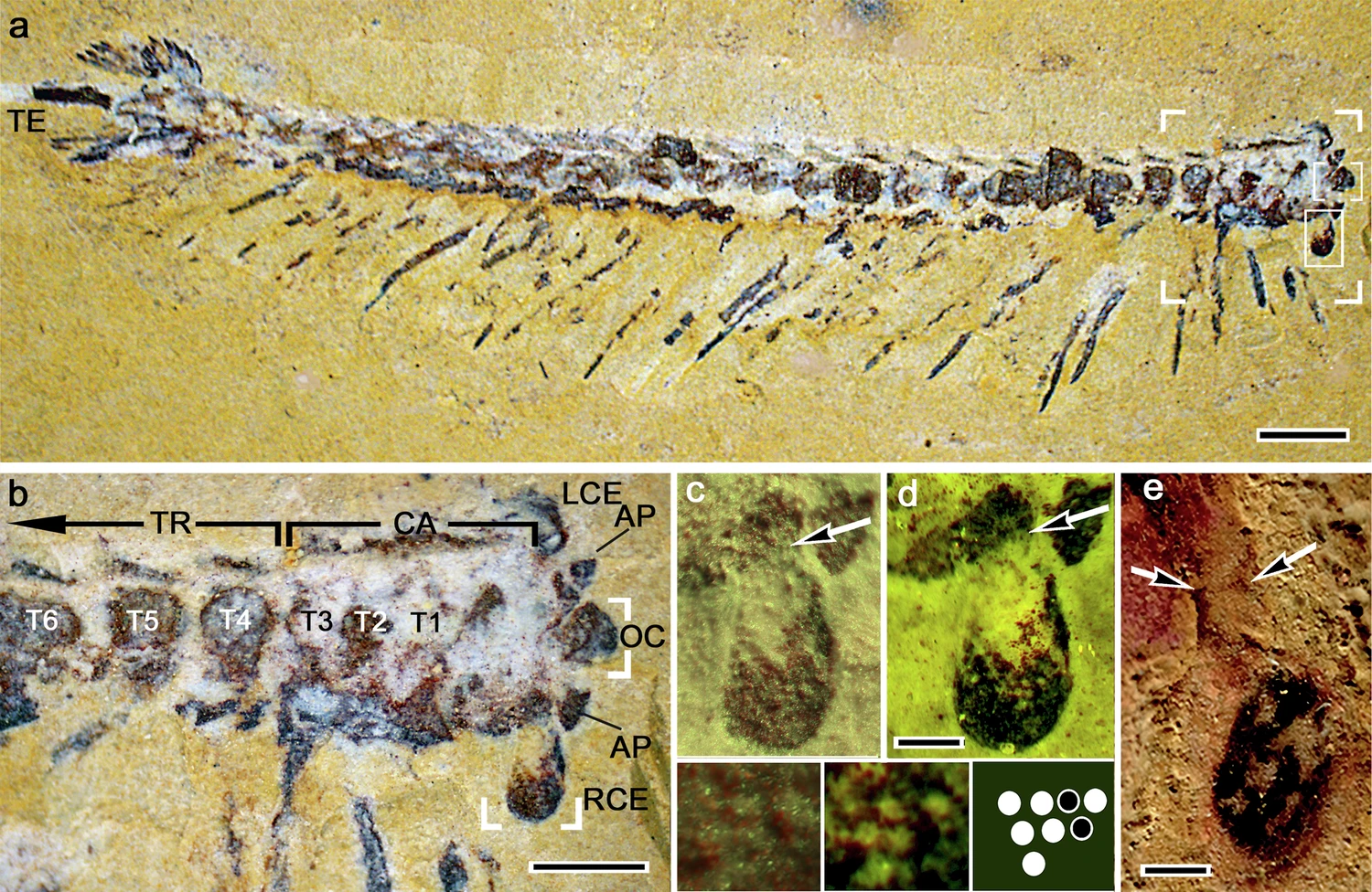 La cabecita de Jianfengia tiene una cubierta dura, apenas una «concha», pero lo que llama la atención son esos dos enormes apéndices prensiles. Justo detrás, los ojos resaltan: compuestos y simples, como una mezcla de gafas multifocales y pequeñas linternas. ¿La esencia de los camarones, las gambas, los cangrejos? Ahí, condensada y esperando ser reconocida por los ojos modernos de la ciencia.